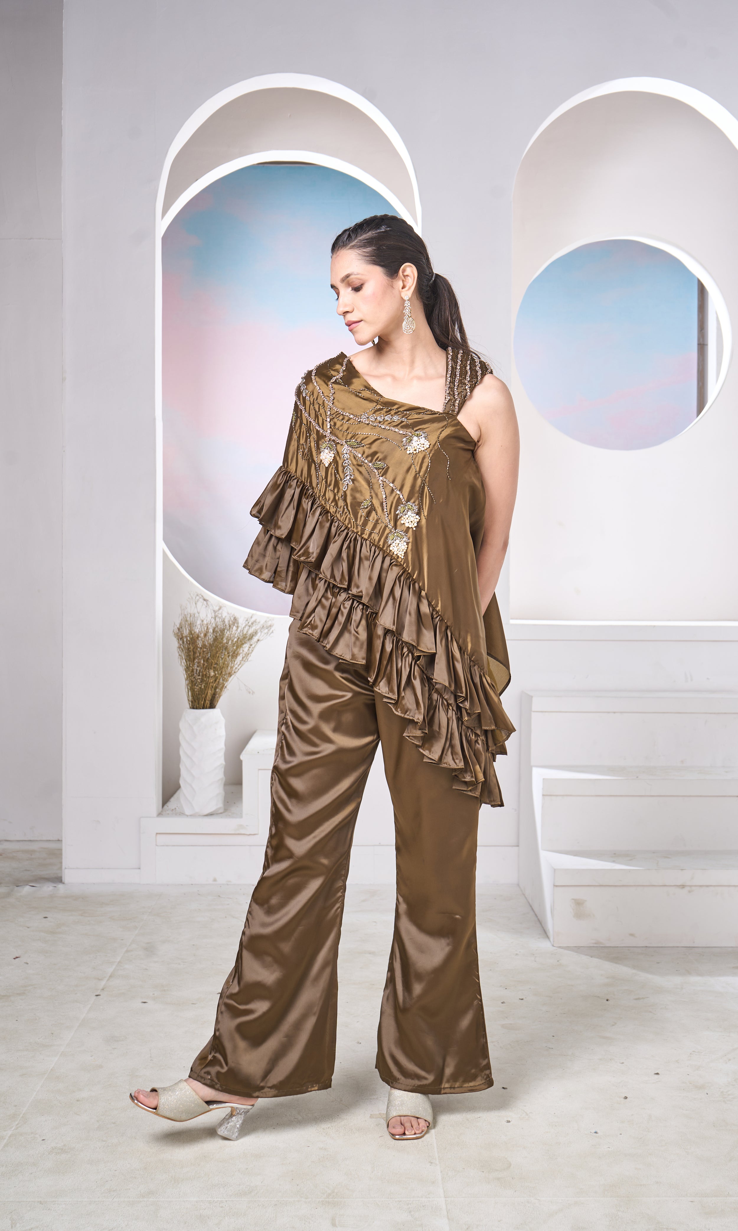 Elevate your evening style with this stunning satin co-ord set featuring an asymmetrical ruffle top adorned with intricate embellishments. Paired with flowy wide-leg pants, this ensemble blends drama and sophistication effortlessly — perfect for festive soirées and special occasions.