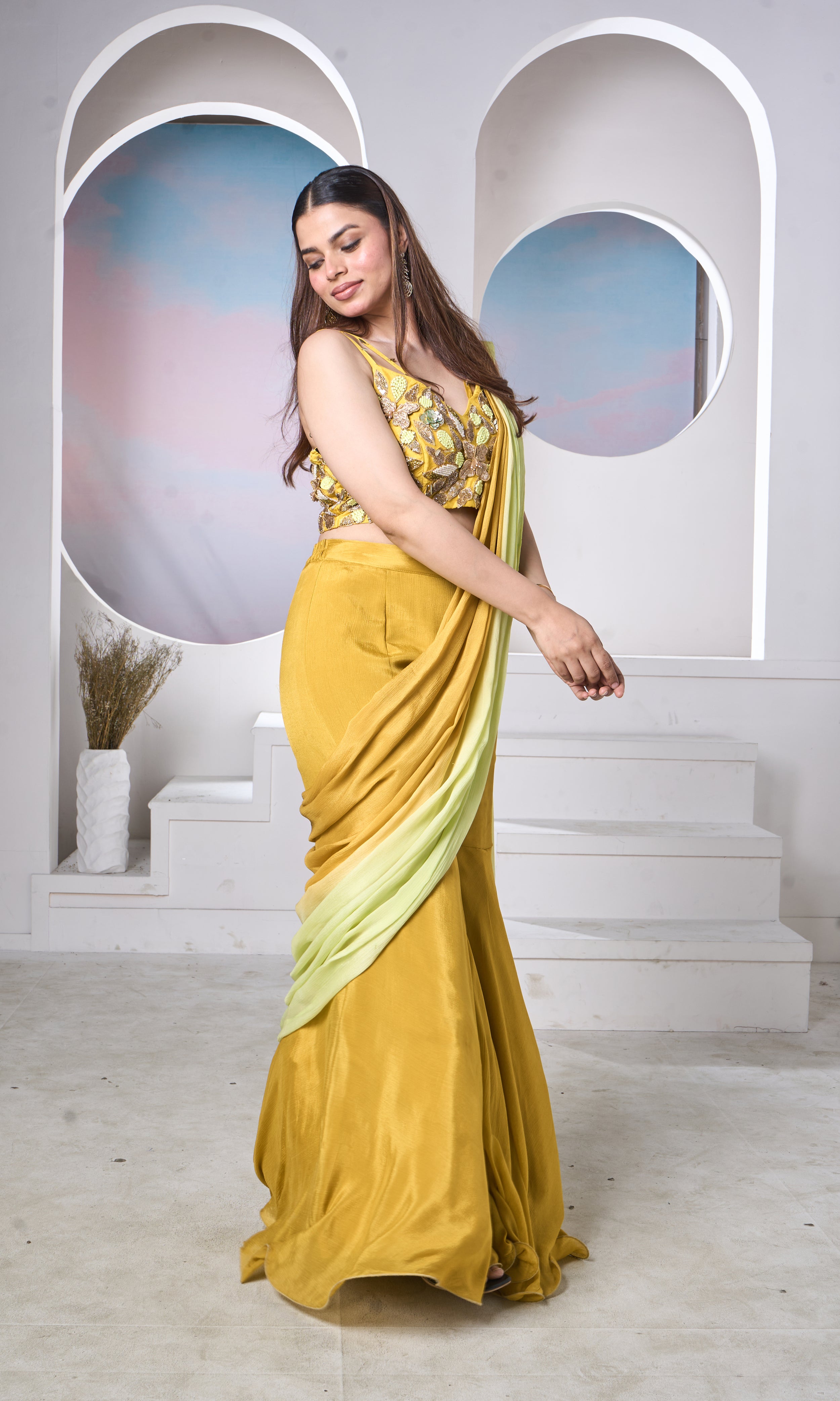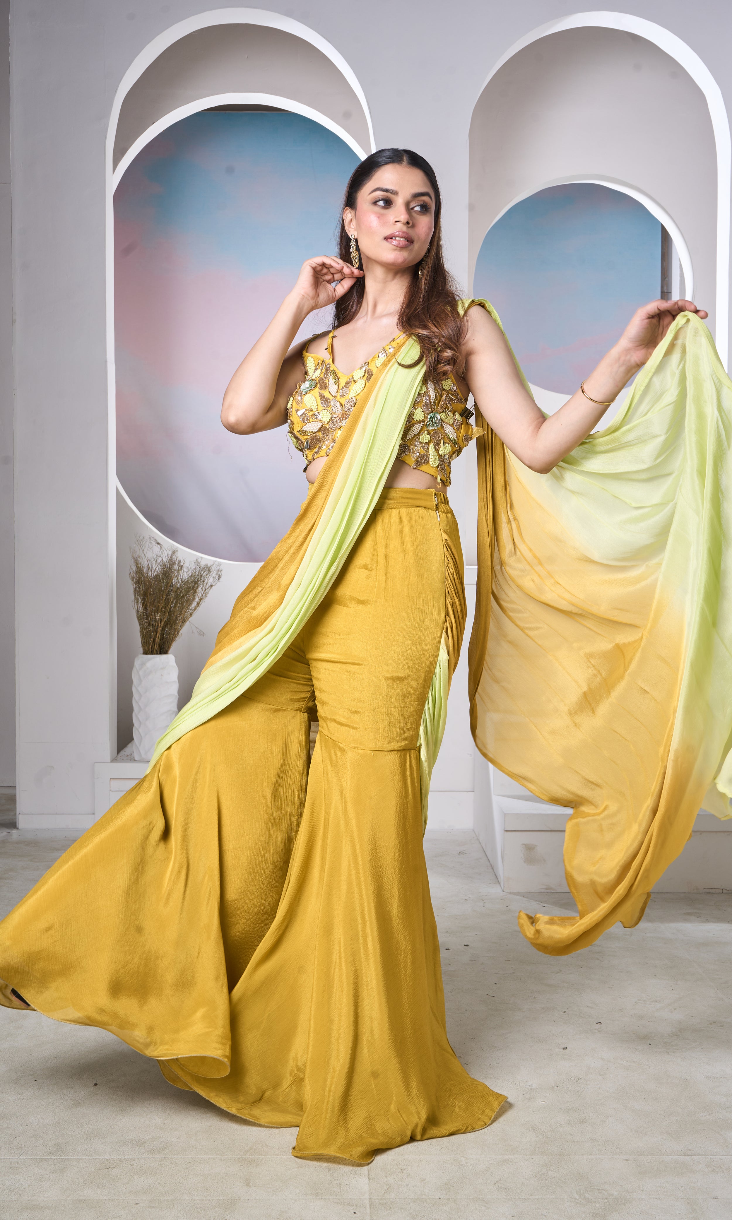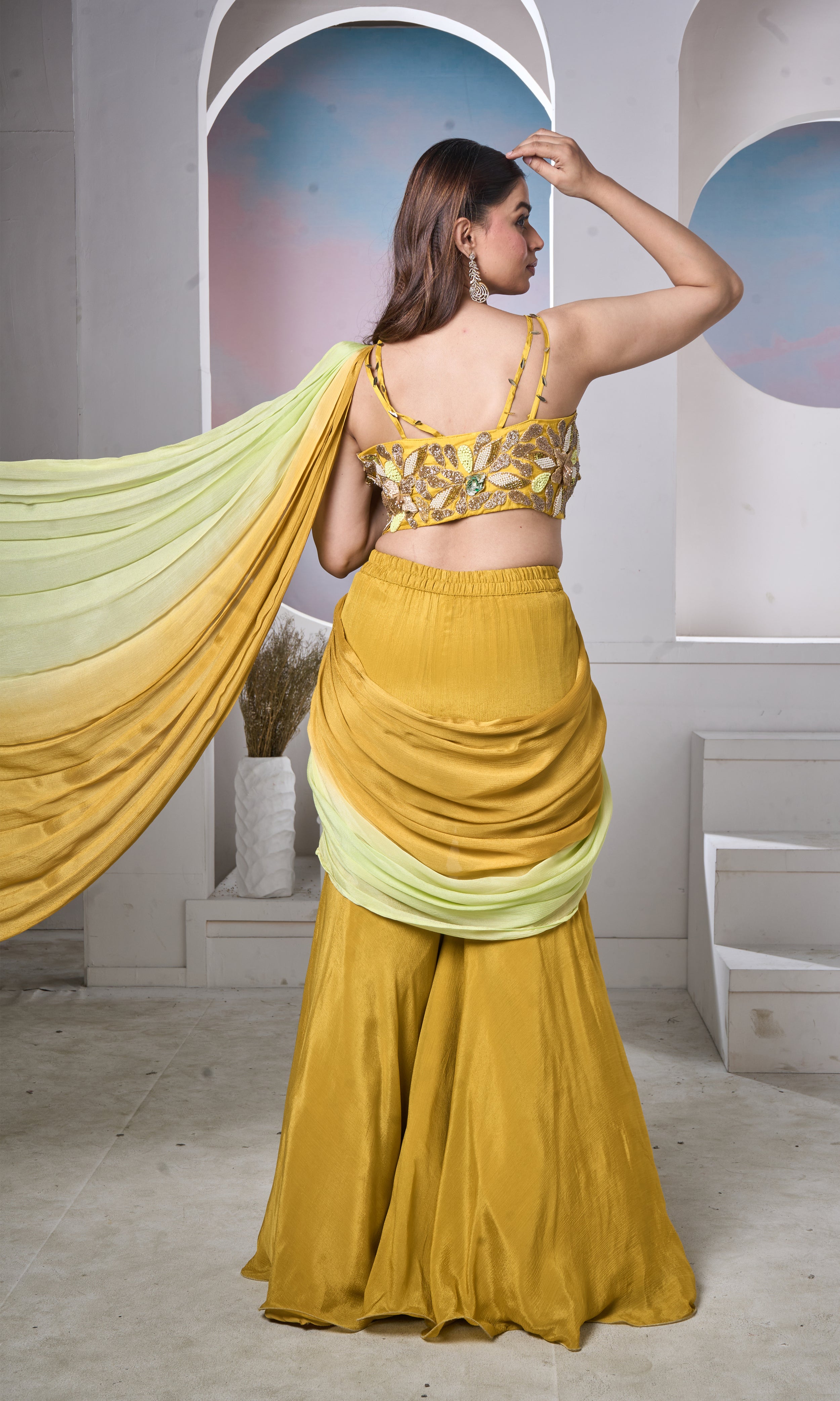 A bold take on festive couture, this mustard sharara set features a statement embroidered blouse with intricate detailing and handcrafted accents. The sculpted high-waisted sharara flows beautifully with every step, while the soft lime drape adds a refreshing contrast. Designed for the modern woman who embraces colour, craft, and confidence.