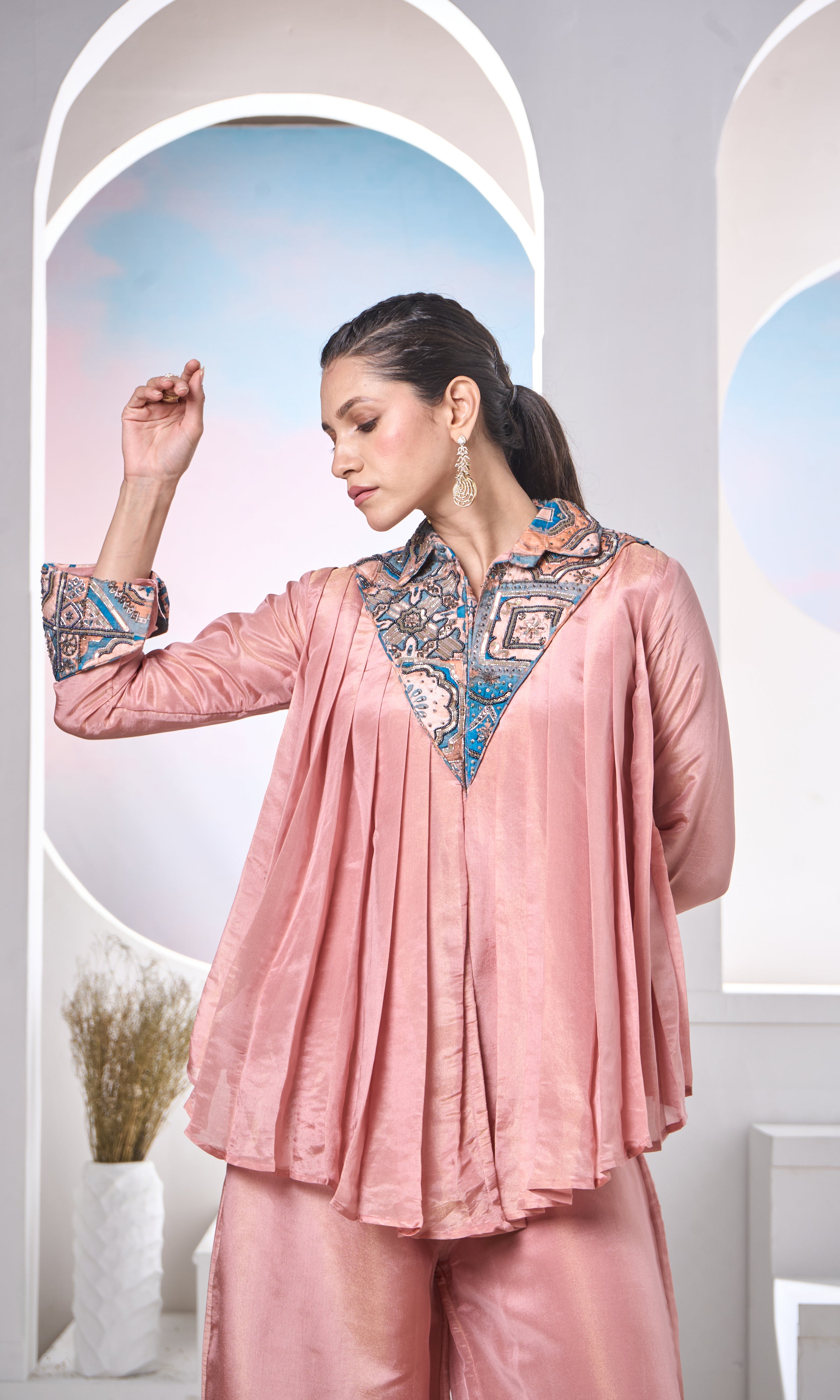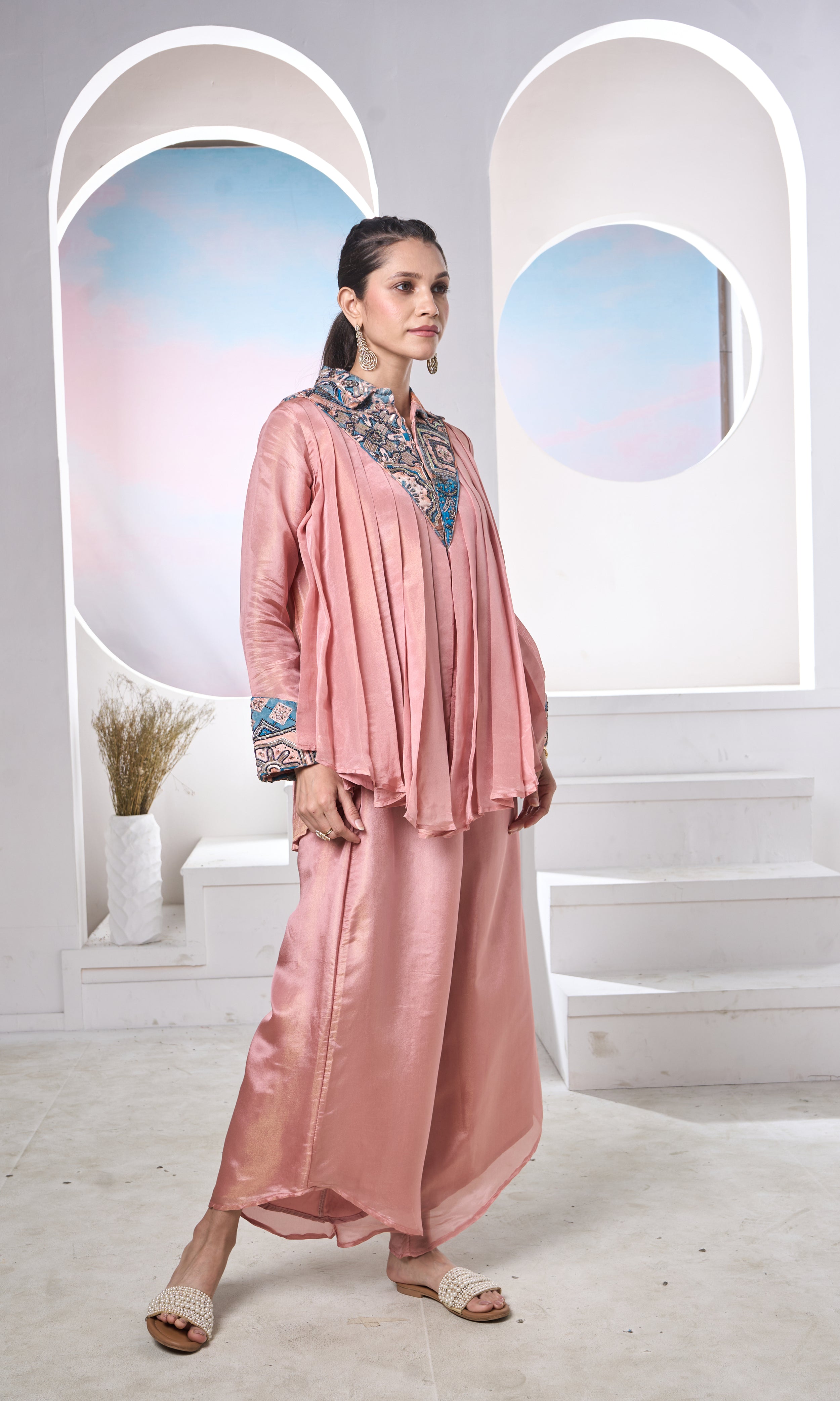 Crafted in a delicate blush hue, this contemporary ethnic set showcases a beautifully detailed embroidered neckline with intricate patterns that elevate the silhouette. The relaxed, pleated kurta drapes gracefully, while the coordinated palazzos add fluid movement and sophistication. Designed for women who appreciate subtle luxury with modern comfort.