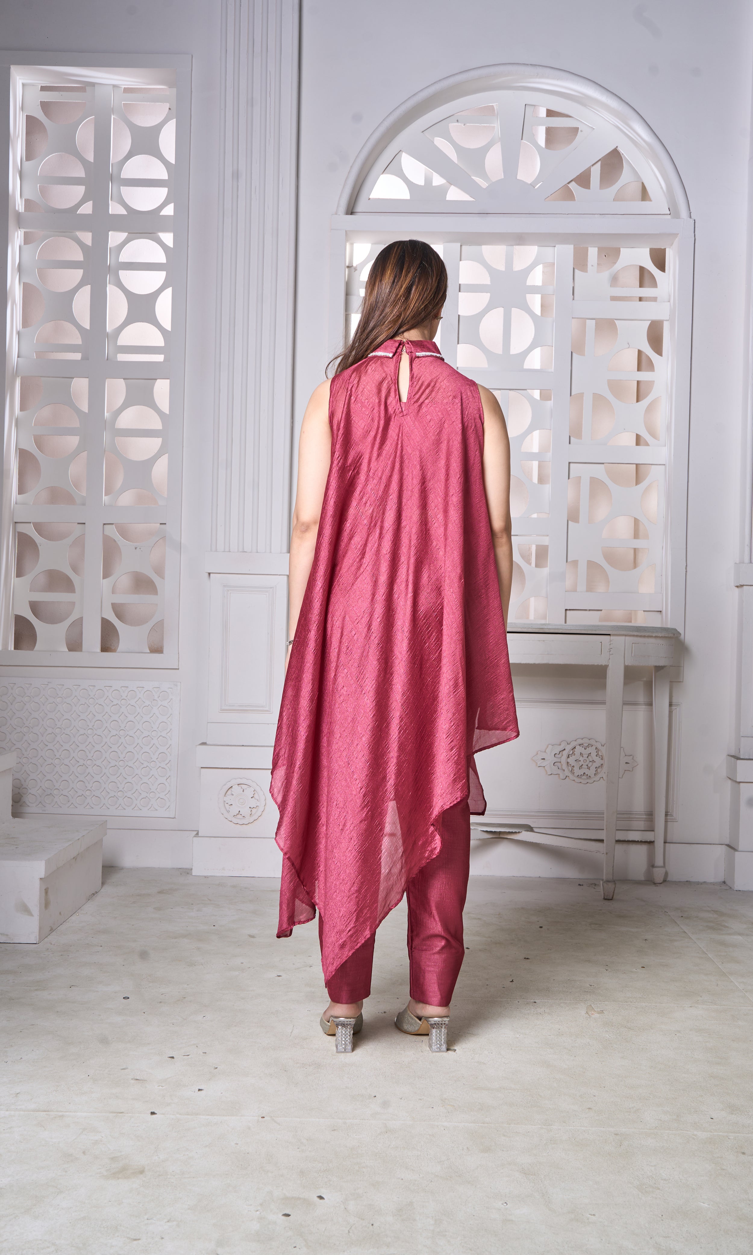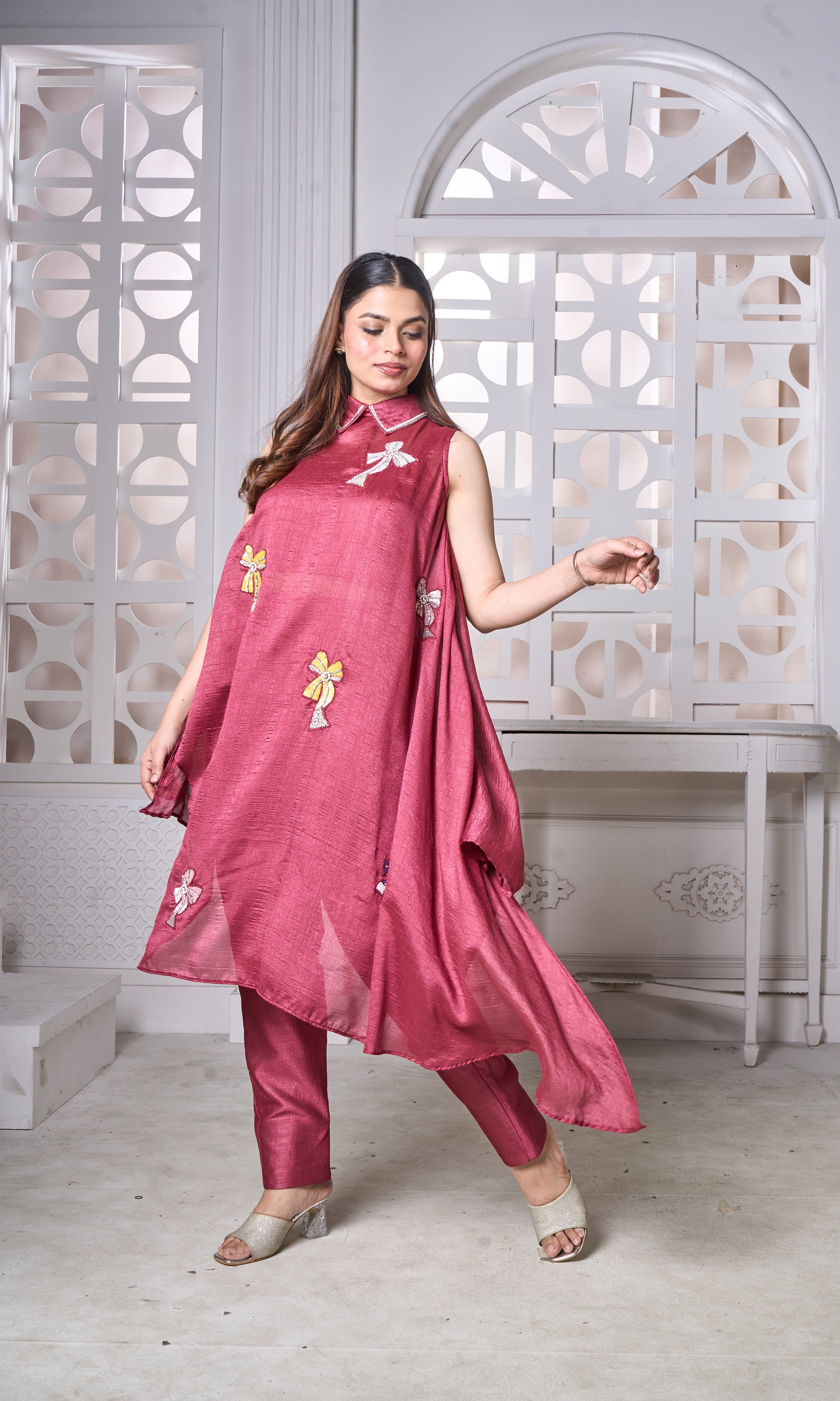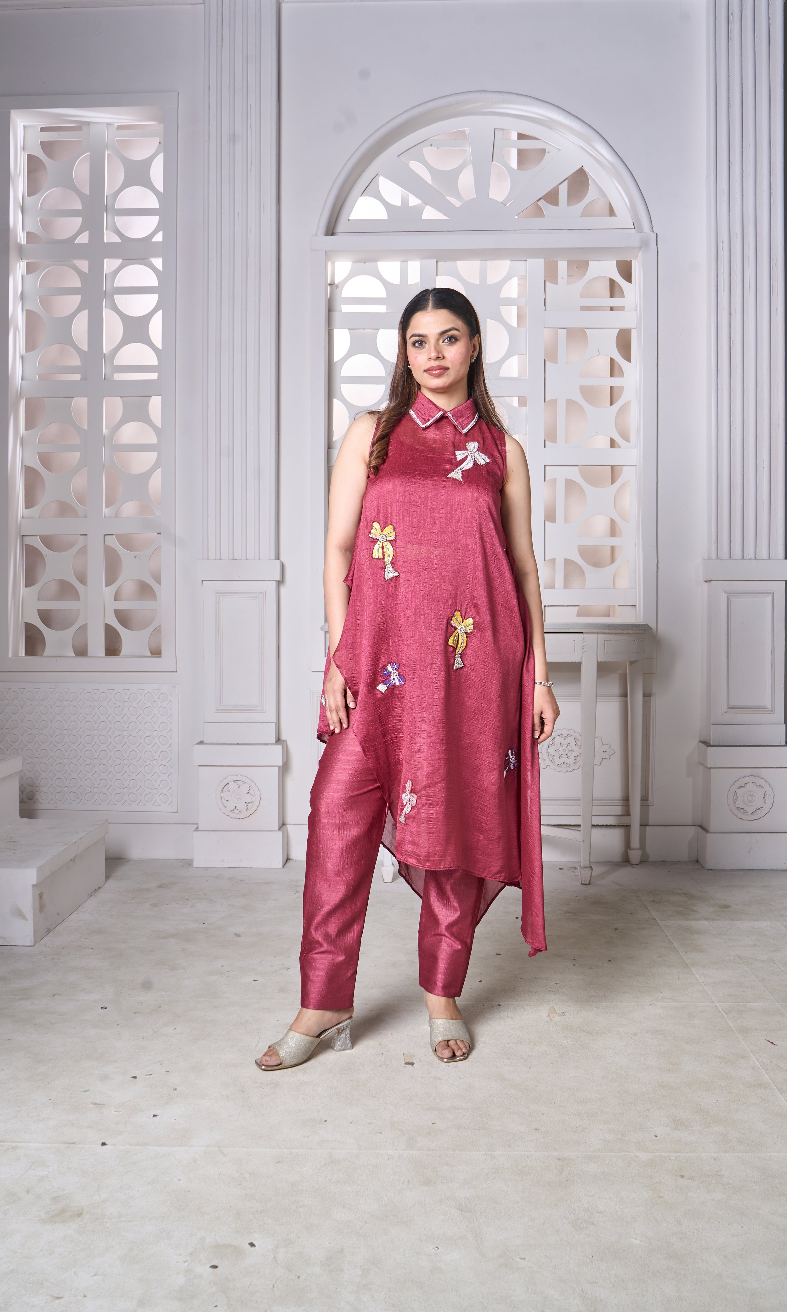 Make a statement in this deep rose asymmetrical kurta set designed for effortless elegance. Crafted in a soft, lustrous fabric, the sleeveless silhouette features delicate collar detailing and playful handcrafted bow embellishments scattered across the front. Paired with tailored straight pants, this ensemble blends comfort with modern festive charm.